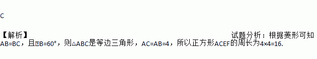 如图,菱形ABCD中,∠B=600,AB=4,则以AC为边长的正方形ACEF的周长为( )