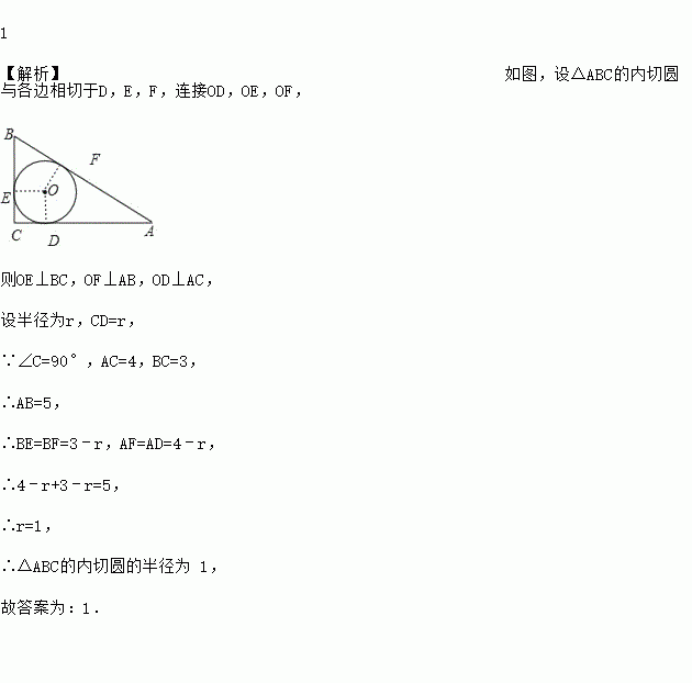 如图,Rt△ABC中,∠C=90°,若AC=4,BC=3,则△ABC的内切圆半径r=_____.
