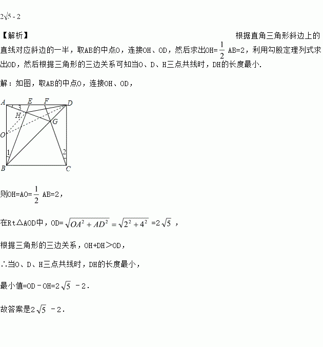 如图,点P是正方形ABCD的对角线BD上的一个动点(不与B、D重合),连结AP,过点B作直线AP的垂线,垂足为H,连结DH,若正方形的边长为4,则线段DH长度的最小值是____________
