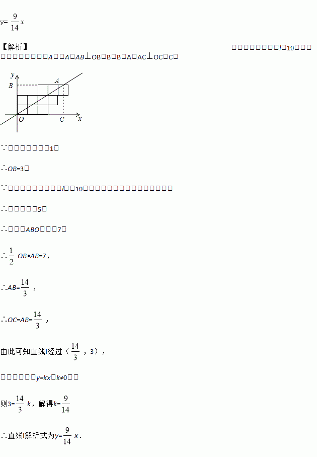 如图,10个边长为1的正方形如图摆放在平面直角坐标系中,经过原点的一条直线l将这10个正方形分成面积相等的两部分,则该直线l的解析式为_____.