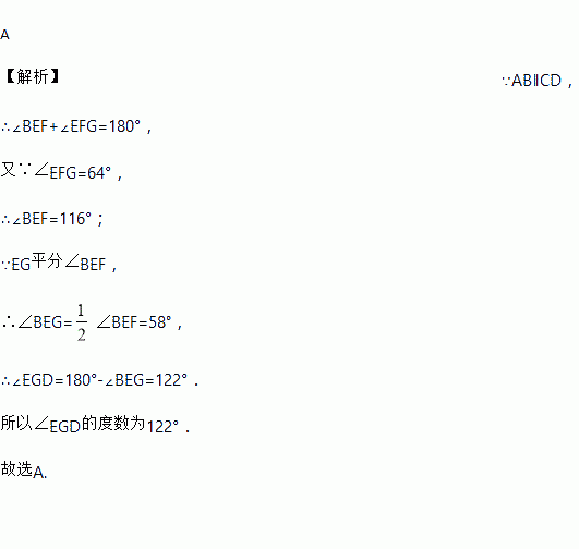 如图,AB//CD ,直线EF分别交AB、CD于点E、F,EG平分∠BEF,如果∠EFG=64°,那么∠EGD的大小是( )