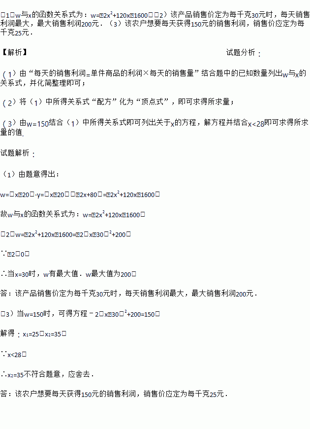 (3)如果物价部门规定这种产品的销售价不高于每千克28元,该农户想要每天获得150元的销售利润,销售价应定为每千克多少元?