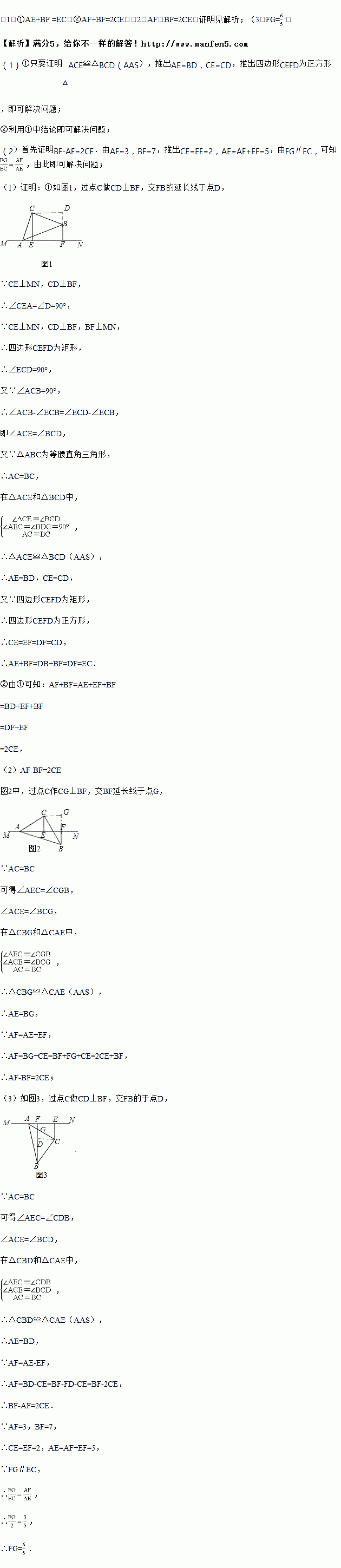 如图,在等腰直角△ABC中,∠C是直角,点A在直线MN上,过点C作CE⊥MN于点E,过点B作BF⊥MN于点F.