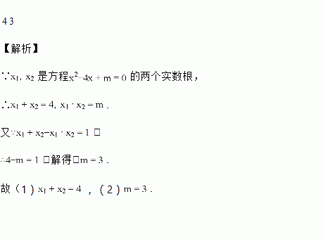 设x1,x2是方程x2-4x+m=0的两个根,且x1+x2-x1x2=1,则x1+x2=____,m=____.