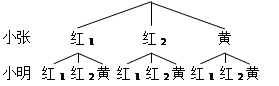 【小题1】根据题意,画出树状图如下: 或列表格如下: 小明小张 红1 红2 黄 红1 红1红1 红1红2 红1黄 红2 红2红1 红2红2 红2黄 黄 黄红1 黄红2 黄黄 ![]()
