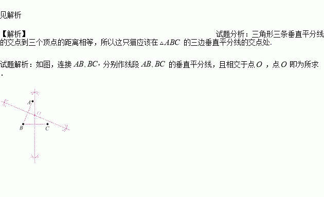 如图,一只猫观察到一老鼠洞的三个洞口A、B、C,这三个洞口不在同一条直线上,请问这只猫应该在什么地方才能最省力同时顾及三个洞口?作出这个位置.