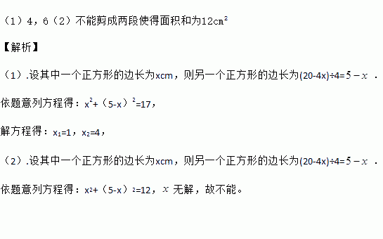 (1)要使这两个正方形的面积之和等于17cm2,那么这段铁丝剪成两段后的长度分别是多少?