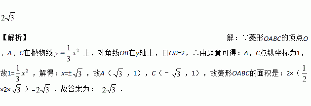 如图,菱形OABC的顶点O、A、C在抛物线上,其中点O为坐标原点,对角线OB在y轴上,且OB=2.则菱形OABC的面积是_______.