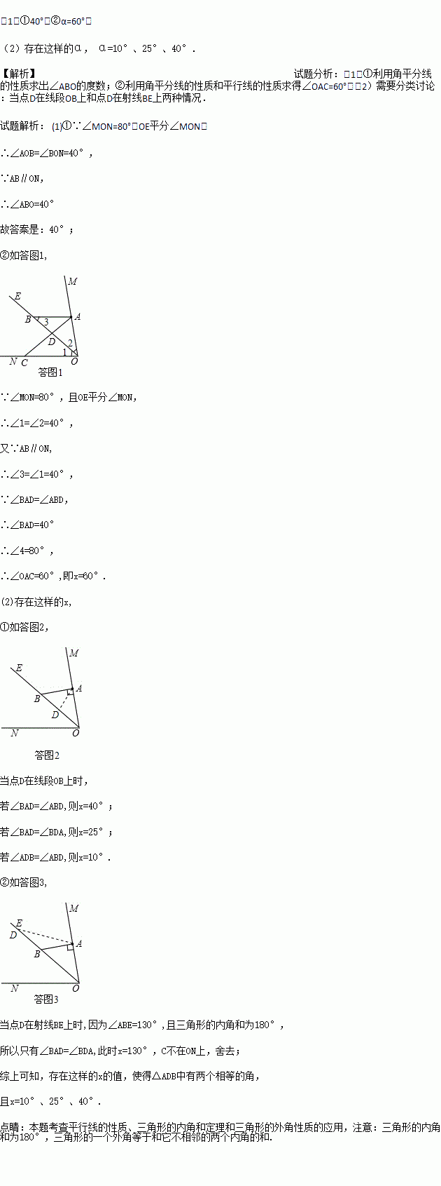 已知:∠MON=80°,OE平分∠MON,点A、B、C分别是射线OM、OE、ON上的动点(A、B、C不与点O重合),连接AC交射线OE于点D.设∠OAC=α.