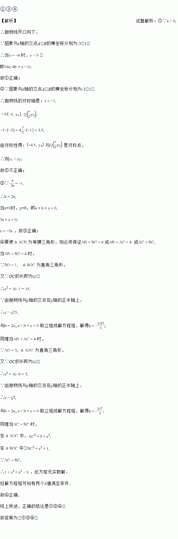 二次函数y=ax2+bx+c(a<0)的图象与x轴的两个交点A、B的横坐标分别为﹣3、1,与y轴交于点C,下面四个结论:①16a+4b+c<0;②若P(﹣5,y1),Q(