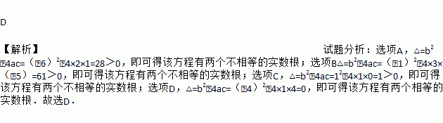 D 【解析】试题分析:选项A,△=b2﹣4ac=(﹣6)2﹣4×2×1=28>0,即可得该方程有两个不相等的实数根;选项B△=b2﹣4ac=(﹣1)2﹣4×3×(﹣5)=61>0,即可得该方程有两个不相等的实数根;选项C,△=b2﹣4ac=12﹣4×1×0=1>0,即可得该方程有两个不相等的实数根;选项D,△=b2﹣4ac=(﹣4)2﹣4×1×4=0,即可得该方程有两个相等的实数根.故选D....