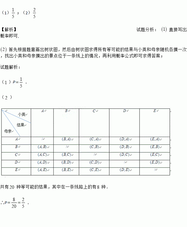 :杨凌现代农业示范园.由于时间仓促,他们只能去其中的两个景点,并且希望两个景点能位于一条线路上.到底去哪两个景点,三人意见不统一.在这种情况下,小英父亲建议,用小英学过的摸卡片游戏来决定.规则如下:在五个背面完全相同的卡片上写上五个景点的代号,然后洗匀,背面朝上放在桌面上,让小英随机摸出一张,不放回,然后让小英母亲再随机摸出一张.照上面的规则,请你解答下列问题: