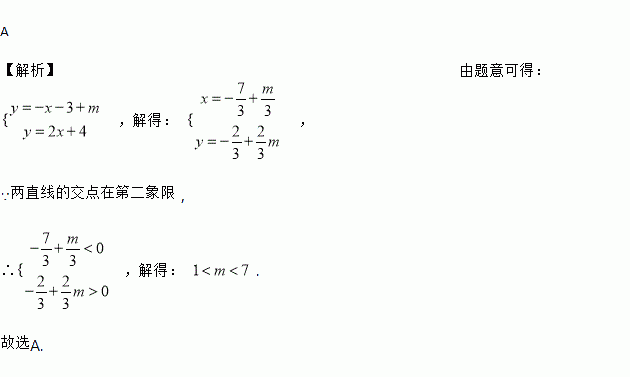 把直线y=-x-3向上平移m个单位后,与直线y=2x+4的交点在第二象限,则m的取值范围是( )