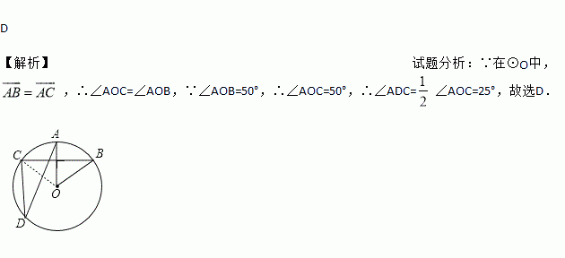 如图,在⊙O中, ,∠AOB=50°,则∠ADC的度数是( )