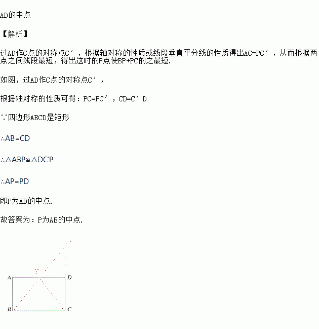 如图,在长方形ABCD的边AD上找一点P,使得点P到B、C两点的距离之和最短,则点P的位置应该在_____.