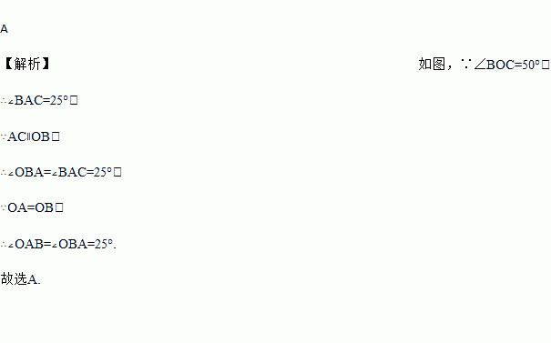 如图,在⊙O中,弦AC∥半径OB,∠BOC=50°,则∠OAB的度数为( )