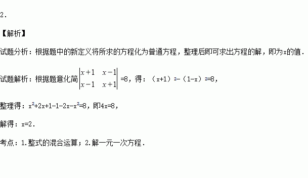 将4个数a、b、c、d排成2行、2列,两边各加一条竖直线记成 ,定义 =ad-bc.上述记号就叫做2阶行列式,若 =8,则x=_______.