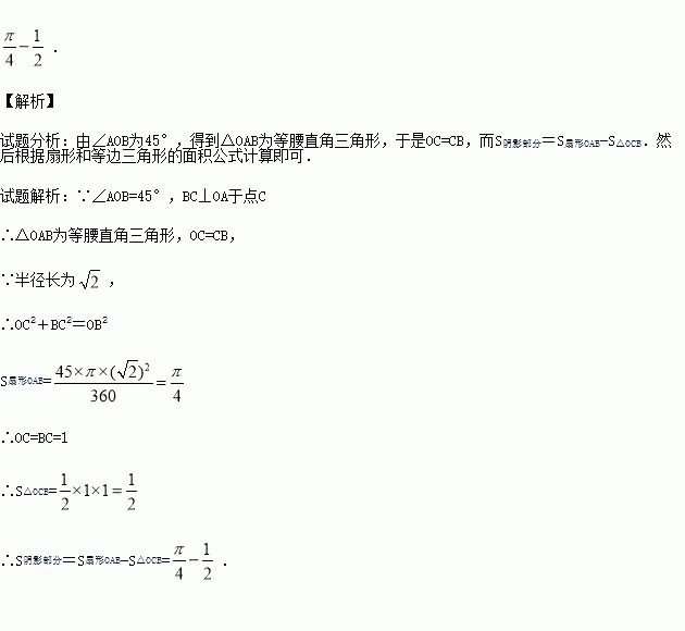 如图,扇形AOB的圆心角为45°,半径长为, BC⊥OA于点C,则图中阴影部分的面积为 .(结果保留π)