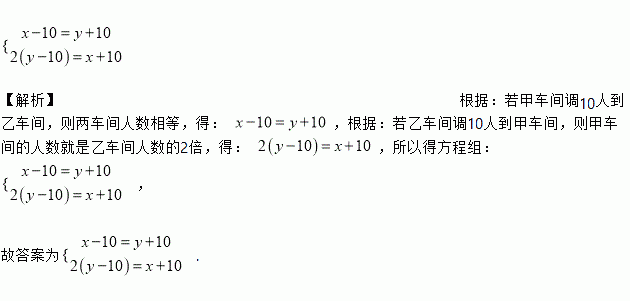 【解析】根据:若甲车间调10人到乙车间,则两车间人数相等,得: ,根据:若乙车间调10人到甲车间,则甲车间的人数就是乙车间人数的2倍,得: ,所以得方程组: , 故答案为.