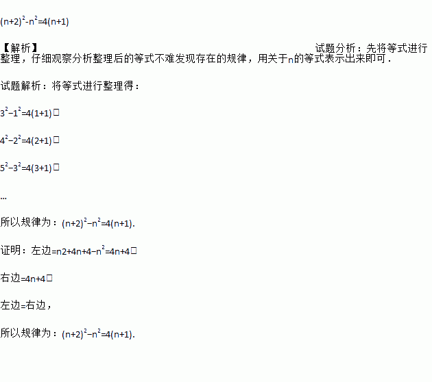 (n+2)2-n2=4(n+1) 【解析】试题分析:先将等式进行整理,仔细观察分析整理后的等式不难发现存在的规律,用关于n的等式表示出来即可. 试题解析:将等式进行整理得: 32?12=4(1+1); 42?22=4(2+1); 52?32=4(3+1); … 所以规律为:(n+2)2?n2=4(n+1). 证明:左边=n2+4n+4?n2=4n+4...