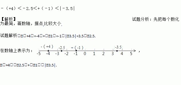 ﹣(+4)<﹣2.5<+(﹣1)<|﹣3.5| 【解析】试题分析:先把每个数化为最简,画数轴,描点,比较大小. 试题解析:﹣(+4)=-4,+(﹣1)=-1,|﹣3.5|=3.5,﹣2.5. 在数轴上表示为: , ﹣(+4)<﹣2.5<+(﹣1)<|﹣3.5|.