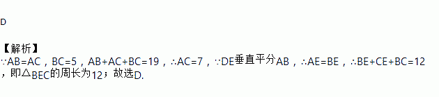 D 【解析】∵AB=AC,BC=5,AB+AC+BC=19,∴AC=7,∵DE垂直平分AB,∴AE=BE,∴BE+CE+BC=12,即△BEC的周长为12;故选D.
