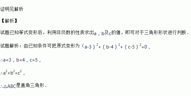 如果ΔABC的三边分别为a、b、c,且满足a2+b2+c2+50=6a+8b+10c,判断△ABC的形状。