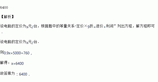 某品牌电脑进价为5 000元,按照定价的9折销售时,获利760元,则此电脑的定价为___元.