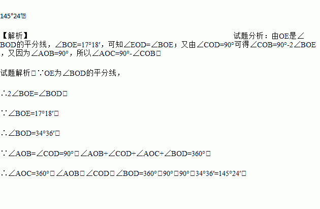 (10分)如图,已知∠AOB=90°,∠COD=90°,OE为∠BOD的平分线,∠BOE=17°18′,求∠AOC的度数.