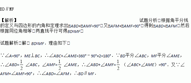 (本题满分10分)如图,在Rt△ABC中,∠A=90°,BD平分∠ABC,M为边AC上一点,ME⊥BC,垂足为E,∠AME的平分线交直线AB于点F.试说明BD与MF的位置关系,并说明理由.