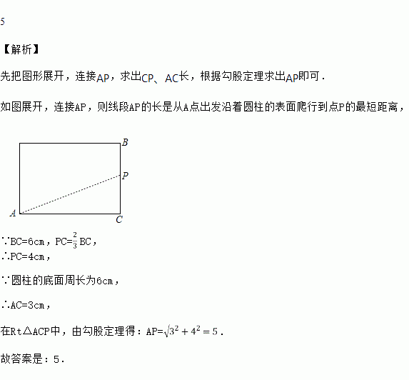 如图, 圆柱的底面周长为,是底面圆的直径, 高,点是母线上一点且. 一只蚂蚁从点出发沿着圆柱体的表面爬行到点的最短距离是_____.