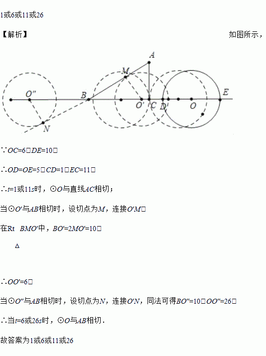 如图,半圆O的直径DE=10cm,△ABC中,∠ACB=90°,∠ABC=30°,BC=10cm,半圆O以1cm/s的速度从右到左运动,在运动过程中,D、E点始终在直线BC上,设运动时间为t(s),当t=0(s)时,半圆O在△ABC的右侧,OC=6cm,那么,当t为_____s时,△ABC的一边所在直线与半圆O所在的圆相切.