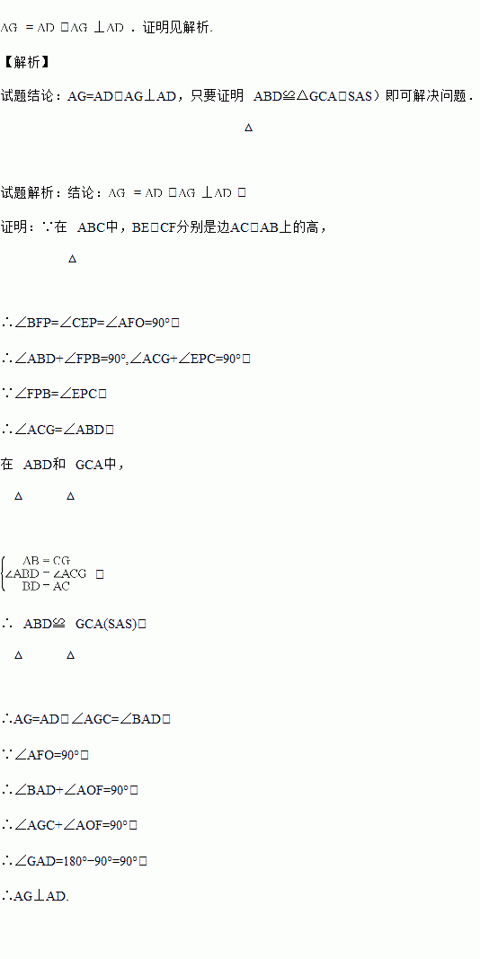 如图,在△ABC中,BE、CF分别是AC、AB两边上的高,在BE上截取BD=AC,在CF的延长线上截取CG=AB,连接AD、AG.试猜想线段AD与AG的数量及位置关系,并证明你的猜想.