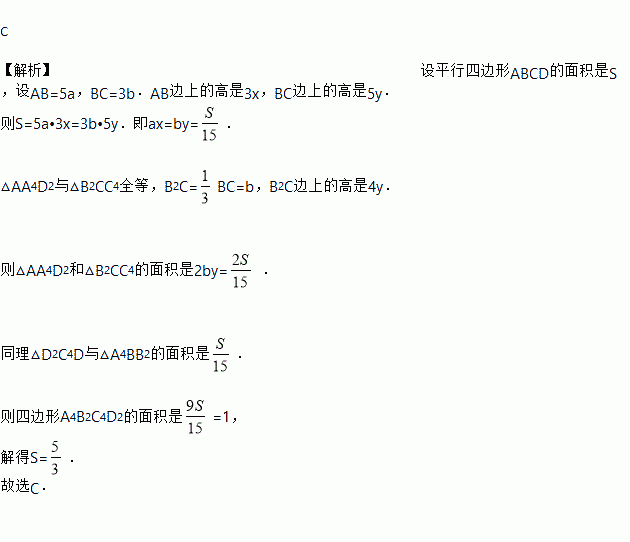 在平行四边形ABCD中,点A1、A2 、A3 、A4 和C1 、C2 、C3 、C4 分别为AB和CD的五等分点,点B1 、B2 和D1 、D2 分别是BC和DA的三等分点,已知四边形A4 B2 C4 D2 的面积为1,则平行四边形ABCD面积为( )