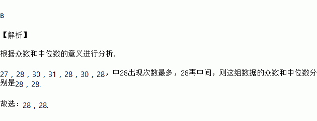 永康市某一周的最高气温统计如下单位::27,28,30,31,28,30,28,则这组数据的众数和中位数分别是