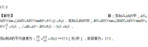 如图,一辆小汽车在公路l上由东向西行驶,已知测速探头M到公路l的距离MN为9米,测得此车从点A行驶到点B所用的时间为0.6秒,并测得点A的俯角为30o,点B的俯角为60o.那么此车从A到B的平均速度为_____米/秒.(结果保留三个有效数字,参考数据: