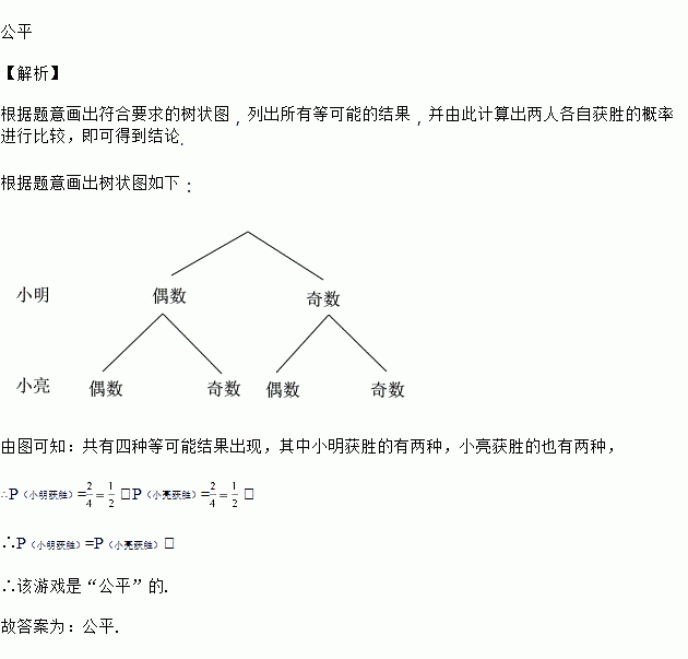 小明和小亮做游戏,先是各自背着对方在纸上写一个自然数,然后同时呈现出来.他们约定:若两人所写的数都是奇数或都是偶数,则小明获胜;否则,小亮获胜.这个游戏对双方_____.(填“公平”或“不公平”).