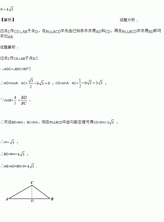 如图,在△ABC中,∠A=30°,cosB=,AC=.求AB的长.