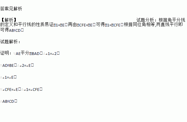 如图,AD∥BE,AE平分BAD,CD与AE相交于F, CFE=E。求证:AB∥CD.