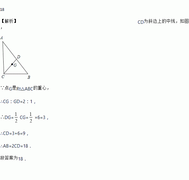 在Rt△ABC中,∠C=90°,点G是Rt△ABC的重心,如果CG=6,那么斜边AB的长等于________ .
