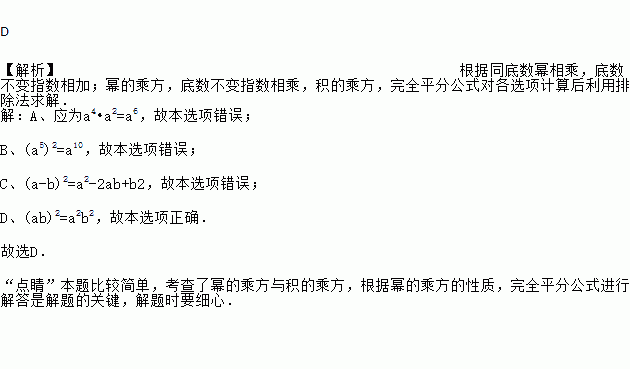A. a4﹒a2=a8 B. (a5)2=a7 C. (a-b)2=a2-b2 D. (ab)2=a2b2