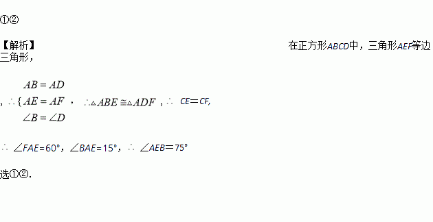 如图,在正方形ABCD中,边长为2的等边三角形AEF的顶点E,F分别在BC和CD上,下列结论:①CE=CF;②∠AEB=75°;③BE+DF=EF.其中正确的结论是________.(填序号)