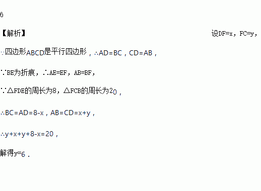如图,在□ABCD中,点E在边AD上,以BE为折痕,将△ABE向上翻折,点A正好落在CD上的点F处.若△FDE的周长为8cm,△FCB的周长为20cm,则FC的长为________.