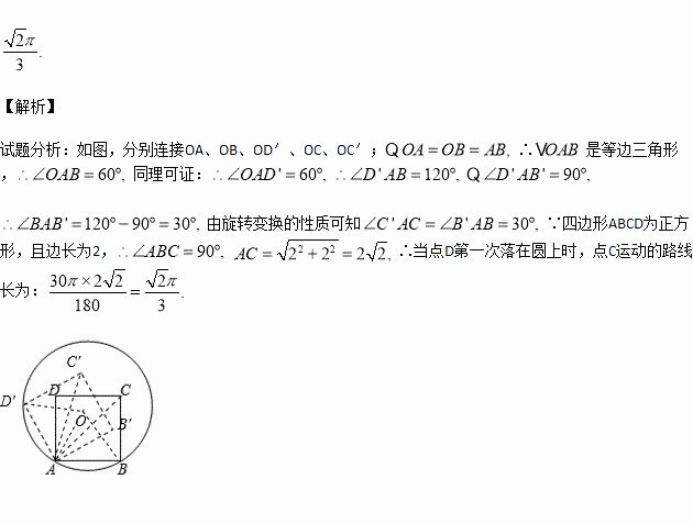 如图所示,边长为2的正方形ABCD的顶点A、B在一个半径为2的圆上,顶点C、D在该圆内,将正方形ABCD绕点A逆时针旋转,当点D第一次落在圆上时,点C运动的路线长为__________.