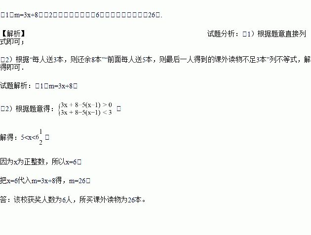 某校为了奖励在数学竞赛中获奖的学生,买了若干本课外读物准备送给他们,如果每人送3本,则剩余8本;如果前面每人送5本,则最后一人得到的课外读物不足3本,设该校买了m本课外读物,有