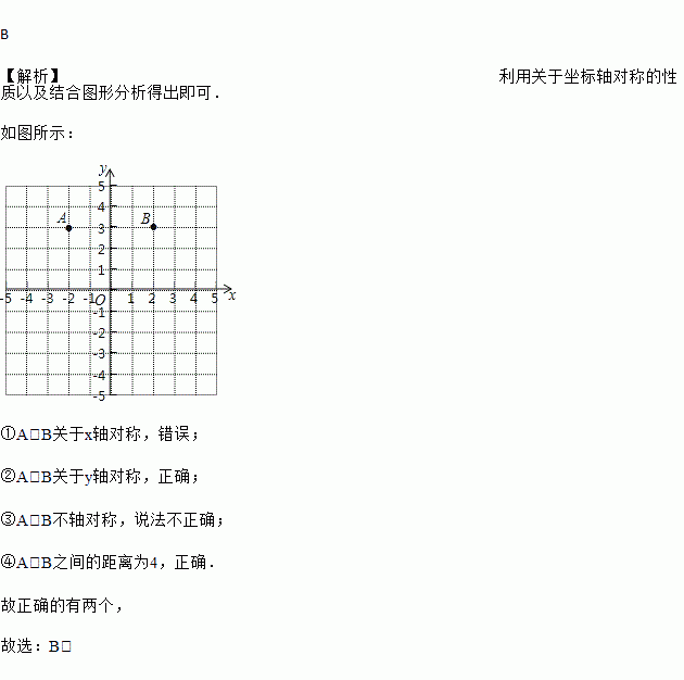 ①A、B关于x轴对称;②A、B关于y轴对称;③A、B不轴对称;④A、B之间的距离为4.