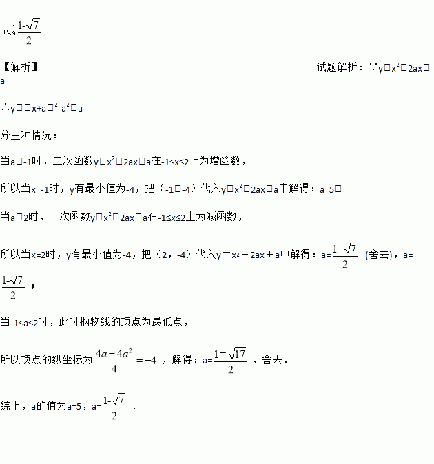 二次函数y=x2+2ax+a在-1≤x≤2上有最小值-4,则a的值为______________.