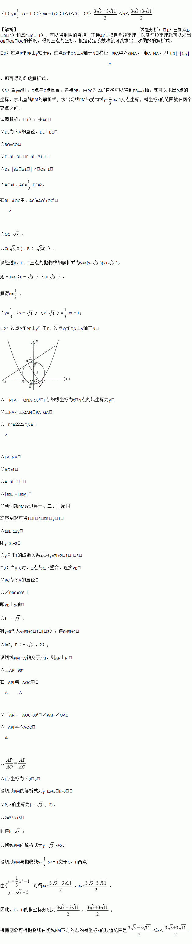 (2)若经过第一、二、三象限的一动直线切⊙A于点P(s,t),与x轴交于点M,连接PA并延长与⊙A交于点Q,设Q点的纵坐标为y,求y关于t的函数关系式,并观察图形写出自变量t的取值范围;