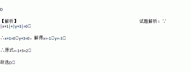 D 【解析】试题解析:∵|x+1|+|y+3|=0, ∴x+1=0,y+3=0,解得x=-1,y=-3, ∴原式=-1+3=2. 故选D.