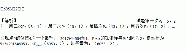 如图,把正方形铁片OABC置于平面直角坐标系中,顶点A的坐标为(3,0),点P(1,2)在正方形铁片上,将正方形铁片绕其右下角的顶点按顺时针方向依次旋转90°,第一次旋转至图①位置,第二次旋转至图②位置…,则正方形铁片连续旋转2017次后,点P的坐标为____________________.